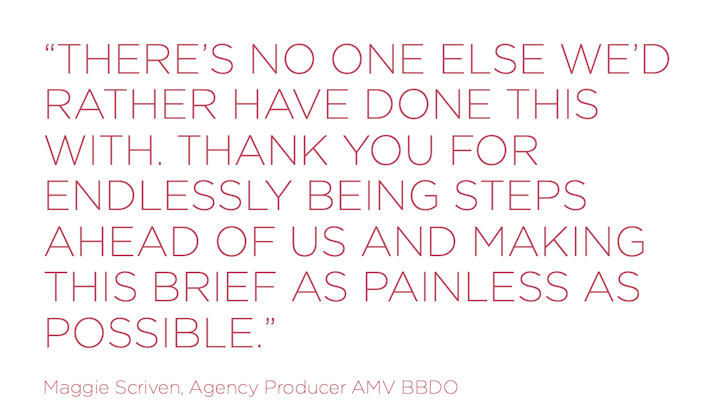 Producing this entire project, from shoot to design to delivery, was a blast and it was a pleasure to be commissioned for it by our friends at AMV BBDO. It’s not often that we get out on set, and there was no better way to set the tone for the next few weeks of work than the atmosphere of the streets of Shoreditch at 5am. We used C4D, XParticles and After Effects to create the marshmallow gloop and mist-filled alleyway once the selects for each film had been made. The entire production happened over the course of a few weeks, which meant we needed to work rapidly and efficiently with minimal disruption. Naturally, however, in the final week one of the films underwent a complete redesign due to unforeseen circumstances. We’re super proud of the team’s efforts, responding as always to pressure with clever solutions, beautiful work and good humour.