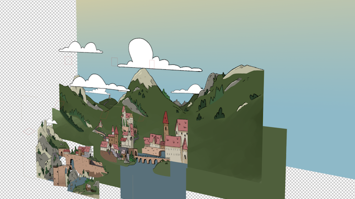 Over 15 artists catalogued terrains of outer space to medieval mountain villages and back again, incorporating some unbelievable techniques in 2D and 3D animation. The expansive project took over 18 months to complete from conception to publication, and charting its progress was no easy feat, as lead artist Lawrence Scanlon explained. “We developed an open brief that artists could explore, the only request was that the creatives used the pink colour of the Blind Pig logo. A camera system that would loop in sections of 3 was developed that would transition from one world to another. People were free to pick and choose their own camera moves initially, allowing us to fill in gaps with those joining as things progressed.”