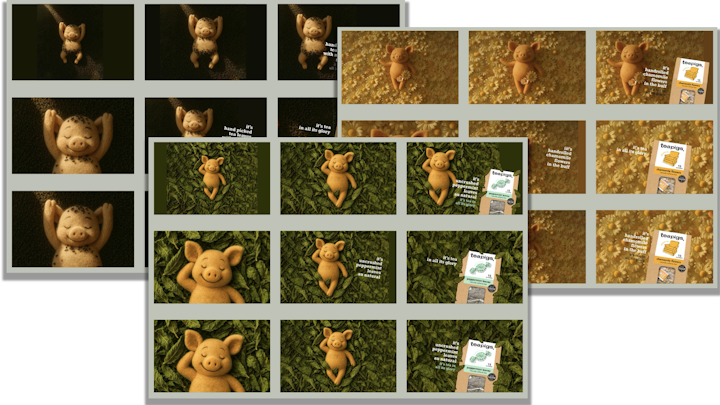We were tasked with bringing a moment of calm to life - in full Zen mode - creating a soft, felted character who’s found his happy place. The pigs were then embedded into a cosy pile of chamomile, peppermint, and tea leaves, all crafted rigurously in Cinema4D, handling everything from modelling and texturing through to final animation. The attention to detail on both the tea leaves, flowers and the pig itself was meticulously crafted by the team, with three distinct campaign videos as a result.