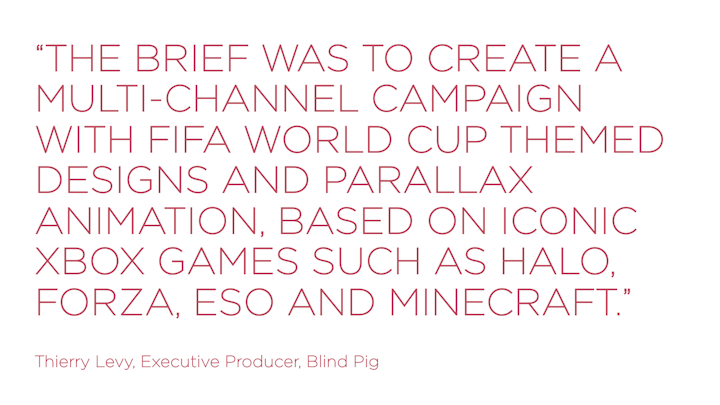 To mark the 2022 FIFA World Cup, we were tasked with creating some 2D parallax animations for Xbox. Working in Cinema 4D and After Effects alongside creative agency, Edelman, our team created a multi-channel social campaign. We incapsulated the French and English teams within multiple recognisable gaming worlds: Halo, Minecraft, The Elder Scrolls and Forza.